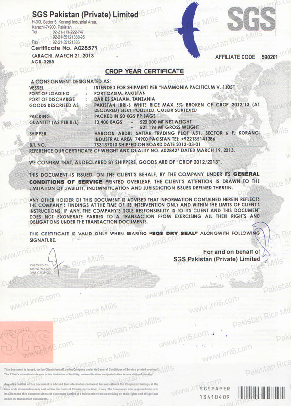 - Crop Year Certificate - issued by third-party surveyor (SGS, InterTek etc).
