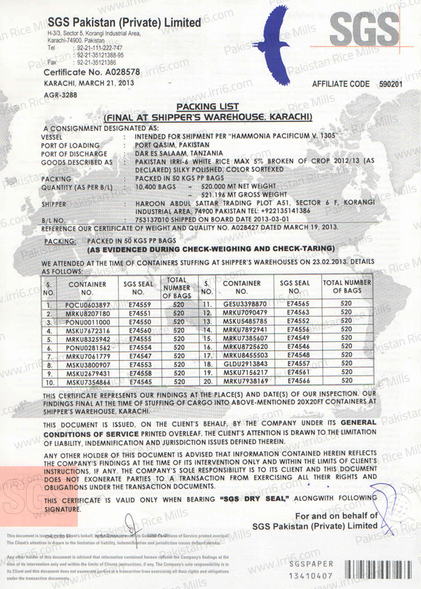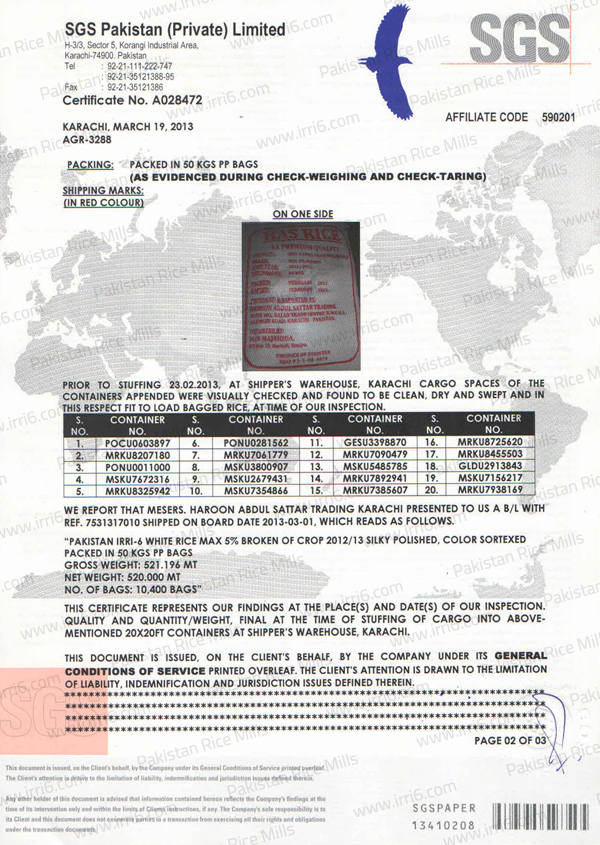 - Prior to loading & again at the time of loading, rice shipment will be stuffed in the containers & fumigated under supervision of the surveyor company (SGS Pakistan, InterTek)