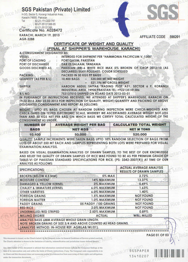 - Certificate of Weight/Quality/Quantity issued by SGS